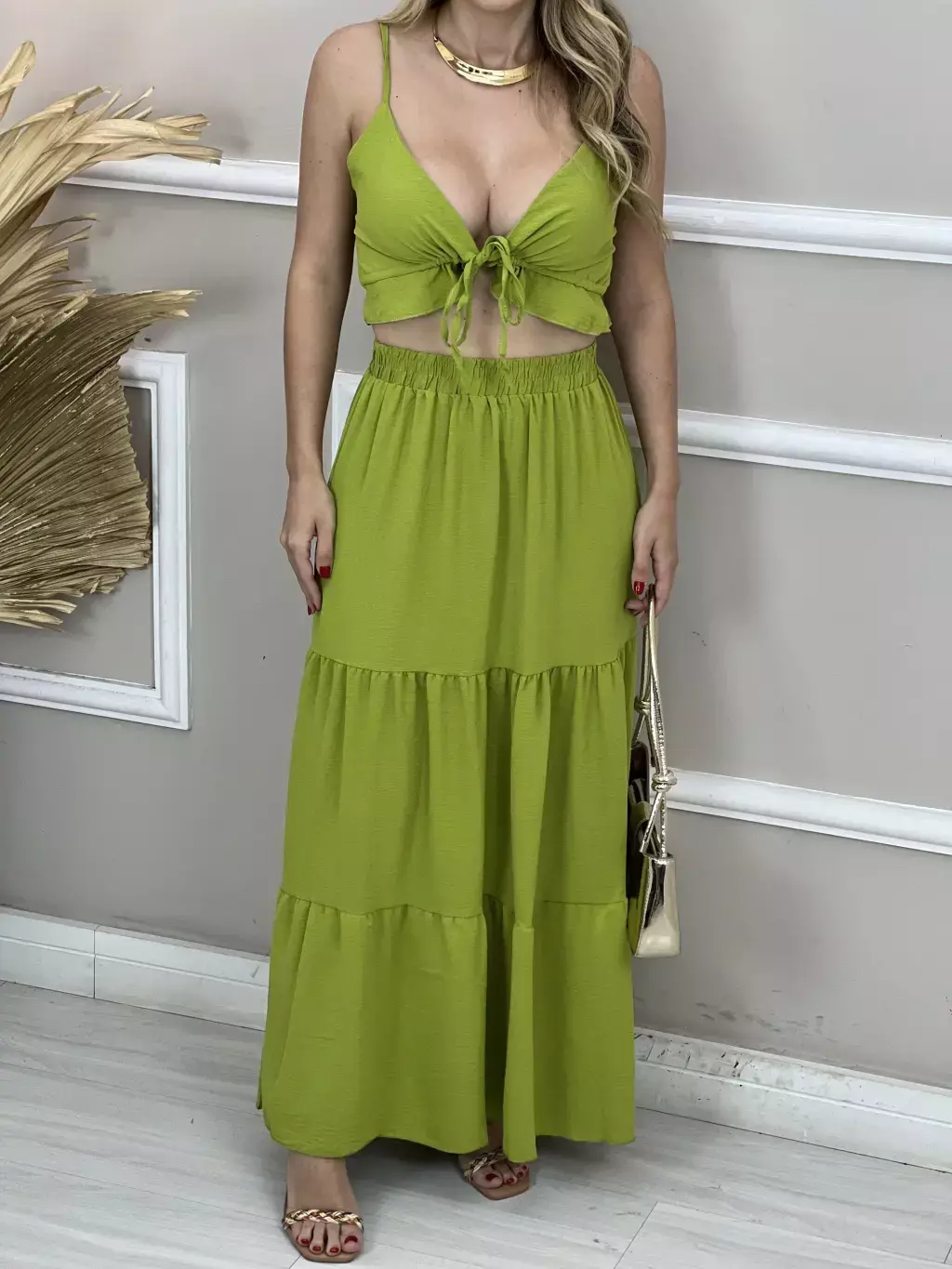 Conjunto feminino composto por saia longa e blusa cropped, confeccionados em tecido crepe. Possui cropped alças finas com tiras para amarração, saia modelo longa com cós de elástico, detalhes de aviamentos na parte da frente acabamento e costura no tom.