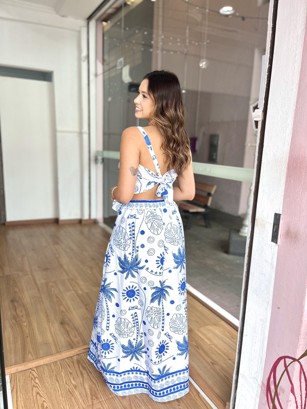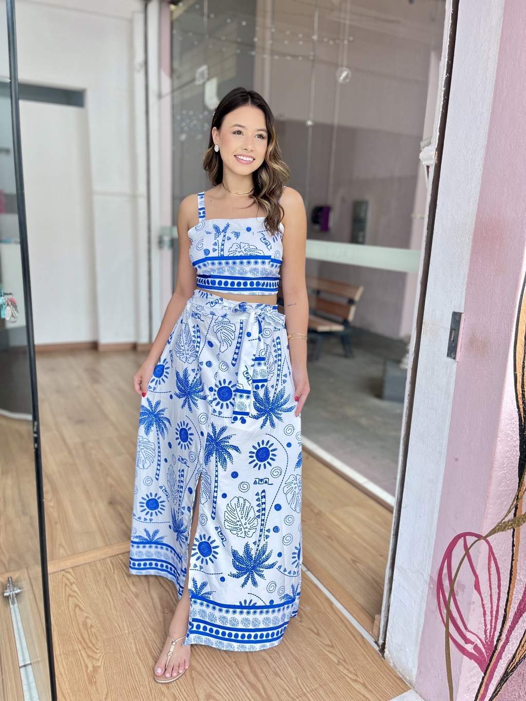 Este conjunto encantador apresenta um cropped com bojo, que realça suas curvas com elegância, e uma saia forrada, garantindo um visual sofisticado. As alças contam com regulagem nas costas, proporcionando um ajuste ideal.